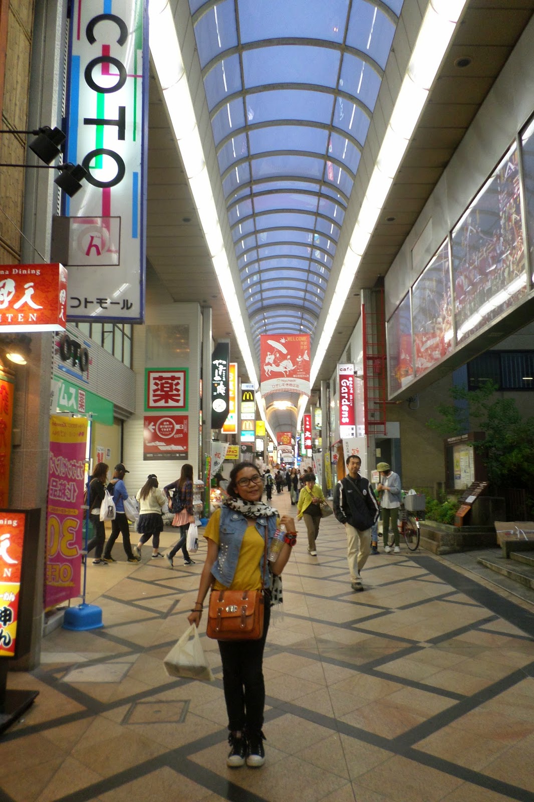Hujannya mulai turun dari jam 4.30 sore di sana, lumayan sih sekitar sejam apa yaa baru reda. Tempat kita berteduh ini disediakan untuk pelancong mahasiswa luar negeri gitu yang butuh informasi apa pun. Saking bingungnya makan apaan, akhirnya belanjanya di Circle K deket sana. Beli bento yang diangetin (398 yen), coklat 'DARTS' yang rasa vanilla (98 yen), sama spidol warna merah (karena baru inget nggak bawa pulpen sama sekali) (119 yen), semuanya 615 yen. Kalau di jepang besar taxnya itu 8%. Hujan sempet reda bentar, jadi memutuskan untuk nyari tempat buat makan dulu habis itu langsung balik ke Namba.